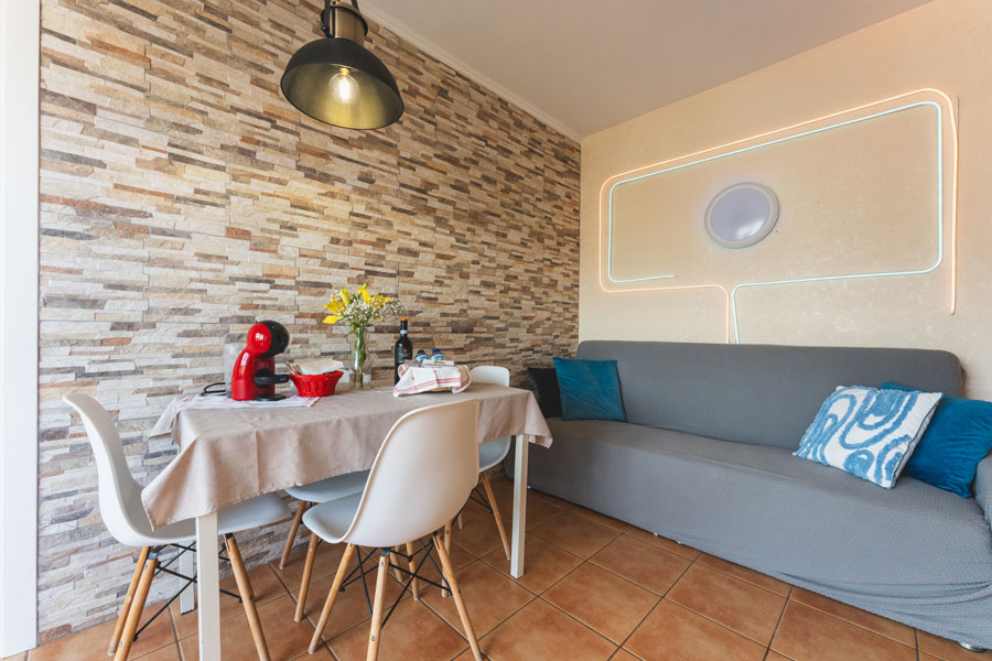 Sala de estar: Un espacio versátil con un sofá cama para una persona extra, y grandes ventanales que llenan la estancia de luz natural.