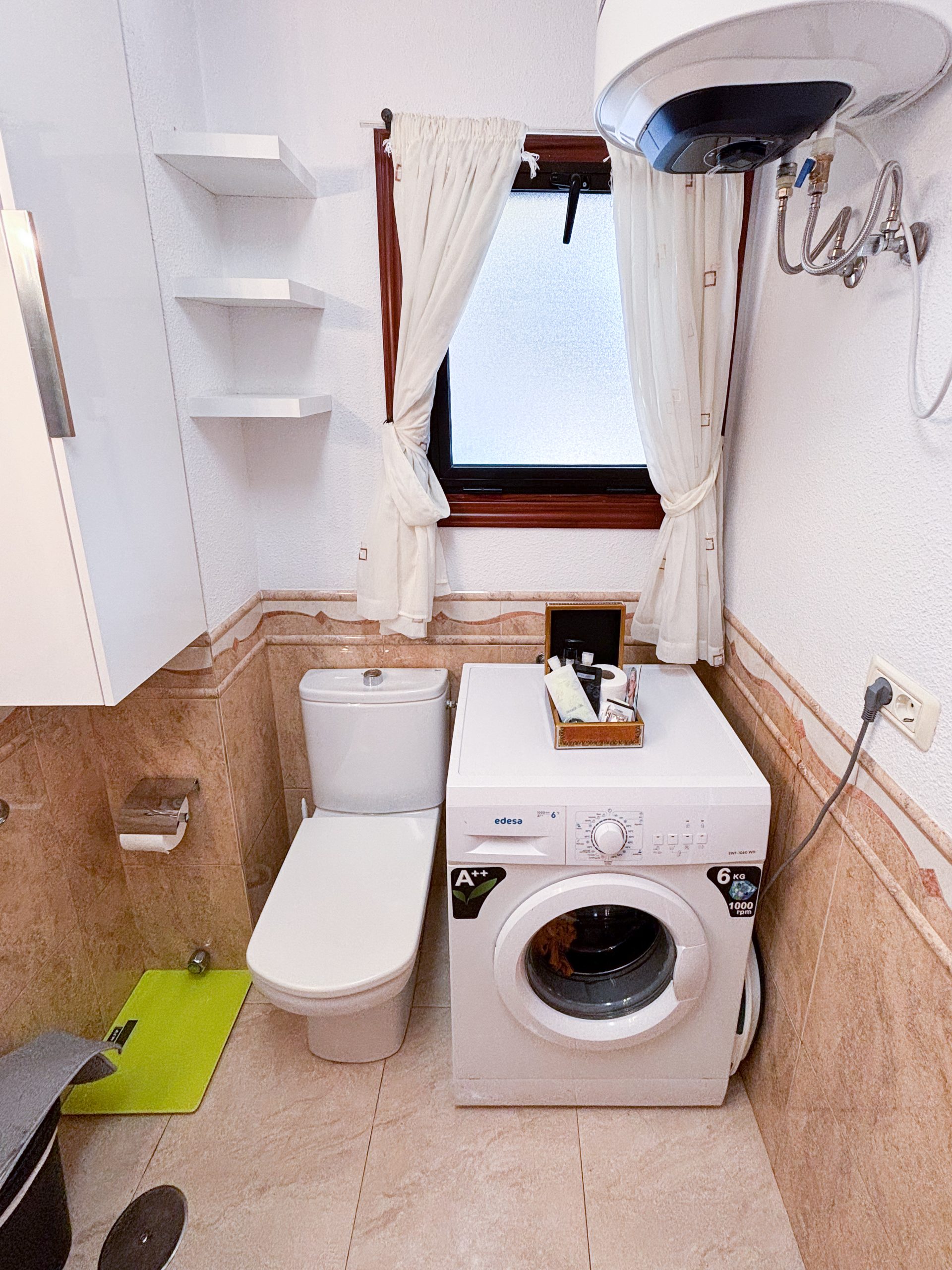 Baño con una amplia ducha y lavadora.
